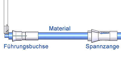 Das Material wird durch die Führungsbuchse und durch den Spindelstock eingezogen und wird durch die Spannzange geklemmt. Die Abgreifspindel ermöglicht die Aufnahme nach dem Schnitt.