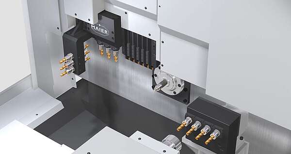 6 Drehlinge 12 x 12 mm oder 5 x 16 x 16 mm, 3 angetriebene Werkzeuge quer, gekröpfter Bohrhalter für die Stirnseite mit 5 x Ø 20 mm oder