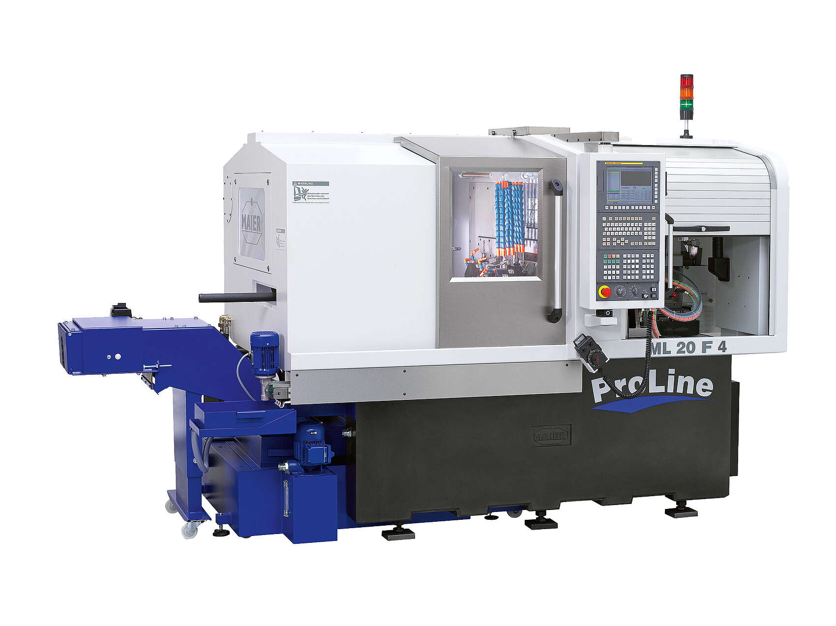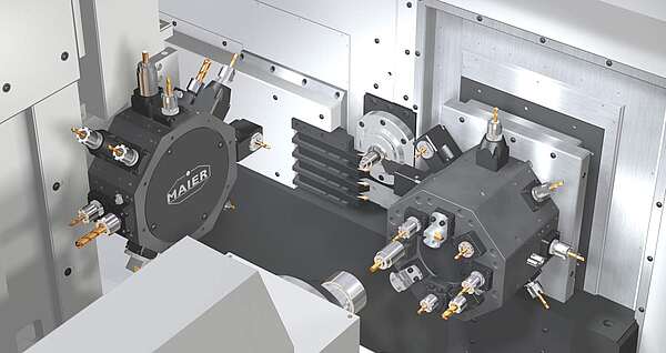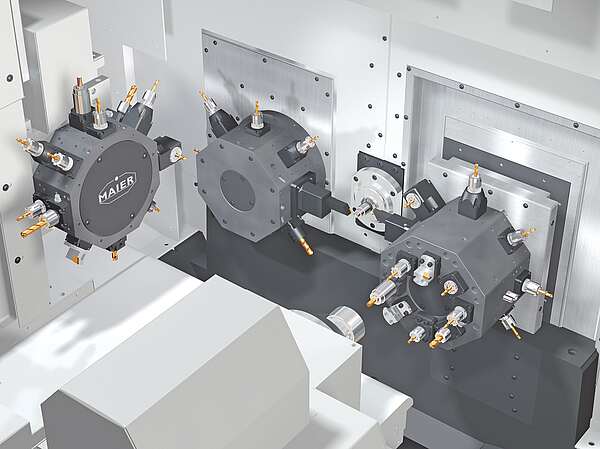 Es lässt sich mit 4 Werkzeugen gleichzeitig arbeiten. Je nach Ausstattung mit bis zu 3 Werkzeugrevolvern.