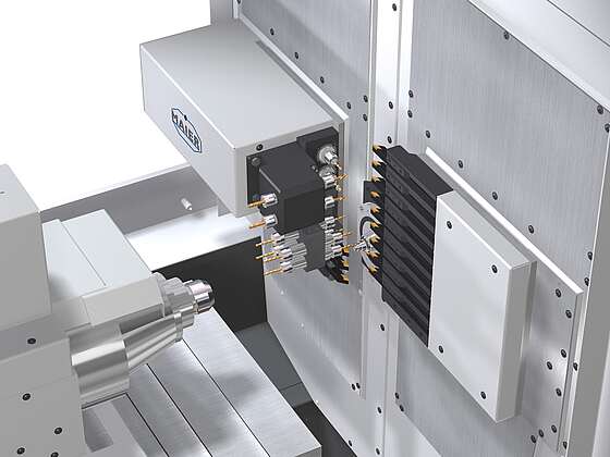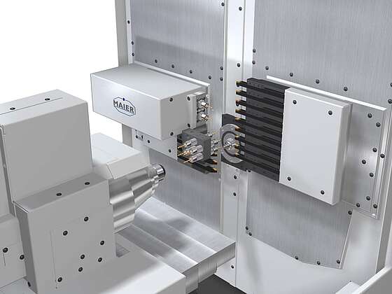 Linearmotoren gewährleisten höchste Dynamik. Das Modell ist mit 26 Werkzeugen ausrüstbar und erreicht Eilgänge von 40 m/min.
